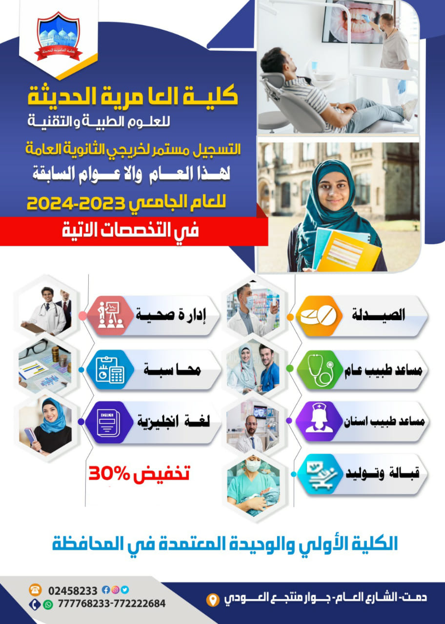 بناء على إعلان وزارة التعليم الفني والتدريب المهني والخاص بتمديد فترة التنسيق والتسجيل للكليات الخاصة عبر البوابة الإلكترونية حتى تاريخ ٢٠٢٣/٩/٢٥تعلن ...كلية العامرية الحديثة للعلوم الطبيه والتقنيه عن إستمرار القبول والتسجيل للعام الجامعي الحالي ٢٠٢٣- ٢٠٢٤ في جميع الأقسام والتخصصات التالية.#دبلوم... إقرأ المزيد